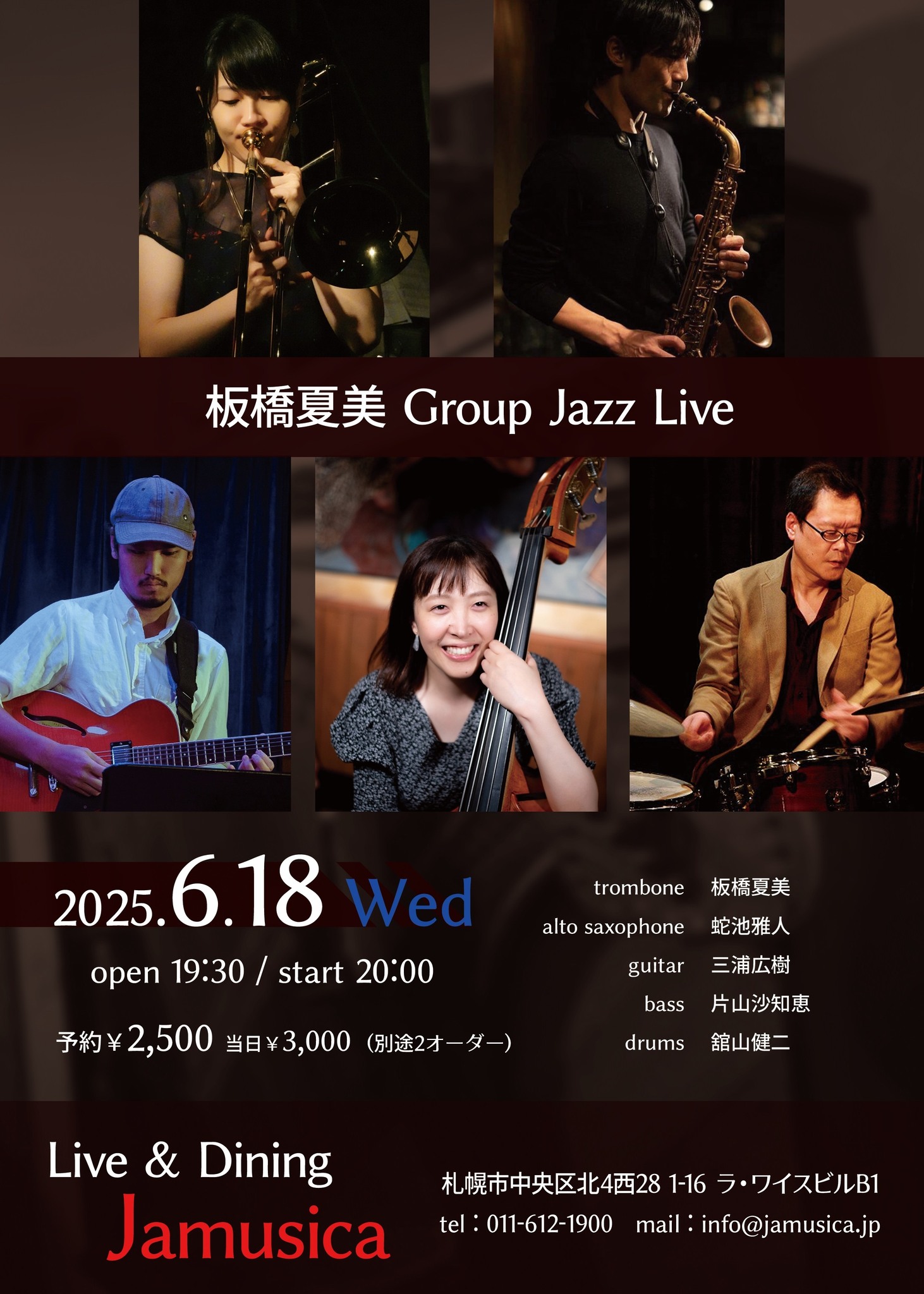 18(水)札幌 Jamusica 板橋夏美Quintet 板橋夏美tb.蛇池雅人s.三浦広樹g.Nick Tradif b.舘山健二ds. 19時半~