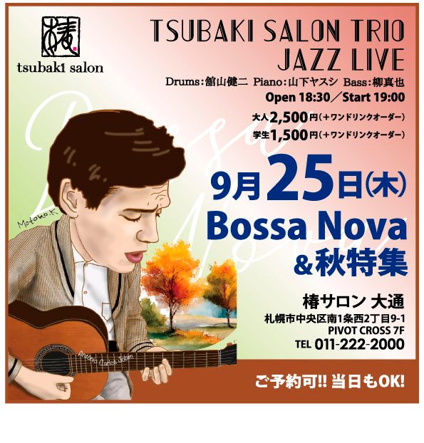 25(木)札幌 椿サロン大通 Tsubaki Jazz Trio 山下ヤスシ(p)柳真也(b)舘山健二(ds) 19:00~ 大人¥2,500 学生¥1,500(+1ドリンクオーダー)