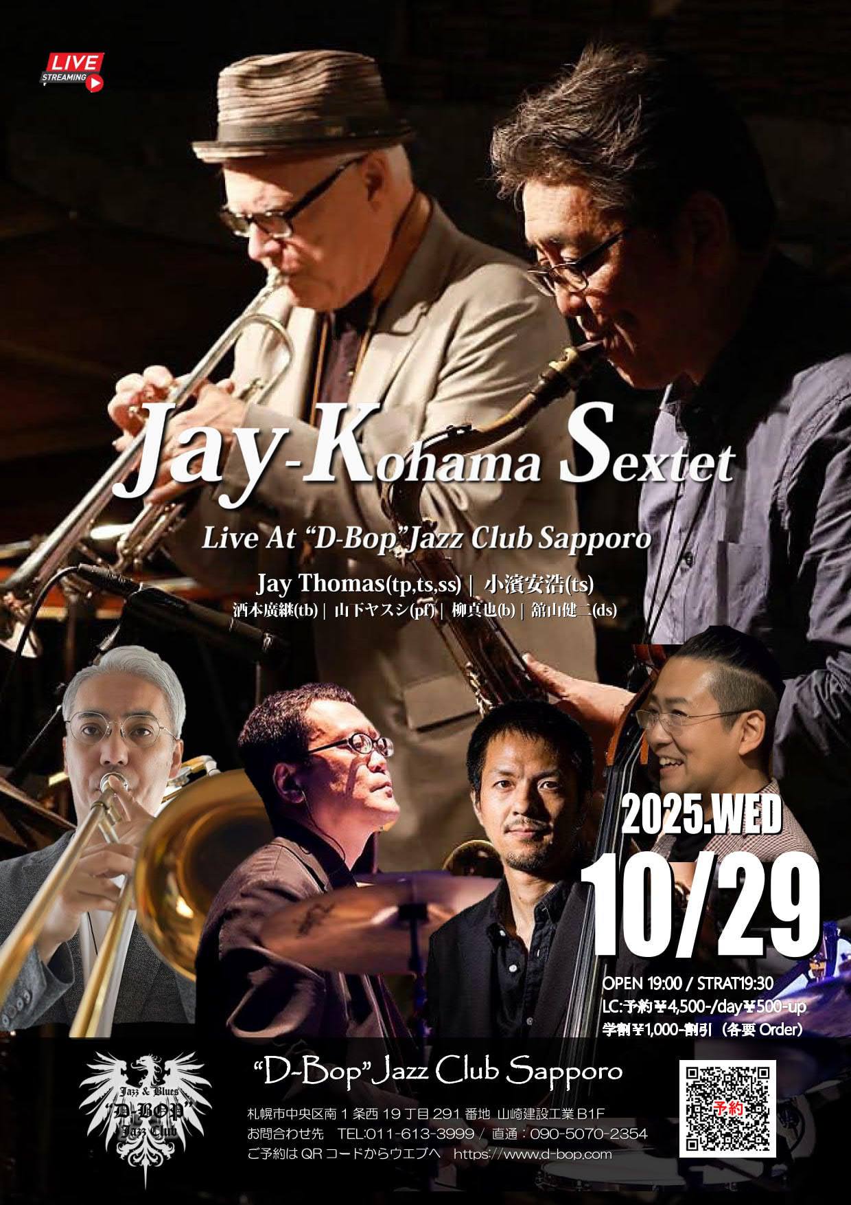 29(水)札幌 D-Bop Jay-Kohama-Sextet Jay Thomas(tp,ts)小濱安浩(ts)酒本廣継(tb)山下ヤスシ(p)柳真也(b)舘山健二(ds) 19:30~ 予約¥4,500 当日¥5,000(要オーダー)